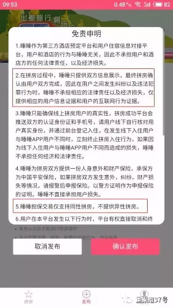 ▲“睡睡”App曾发布“免责声明”,称不提供异性拼房。目前该款App已无法下载或使用。 ?手机截图