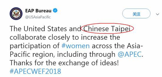 据美媒9月7日报道,美国国务院东亚及太平洋事务局9月6日在社交网站推特上说:“美国与中国台北(Chinese Taipei)为了促进亚太地区的女性参与而密切合作,包括参与亚太经济合作会议(APEC),谢谢大家的参与以及讨论。”