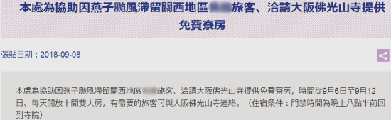 至于另一条则与之前提供“免费住宿”公告类似,称“办事处”已和日本当地寺庙沟通,从9月6日至9月12日每天开放十间双人房,“有需要的旅客可与大阪佛光山寺连络”,而且标明住宿还有条件:“门禁时间为晚上八点半前回到寺院”。