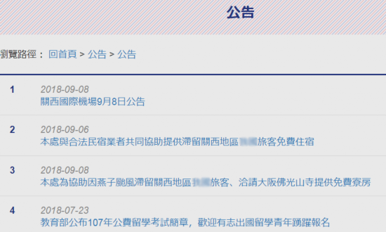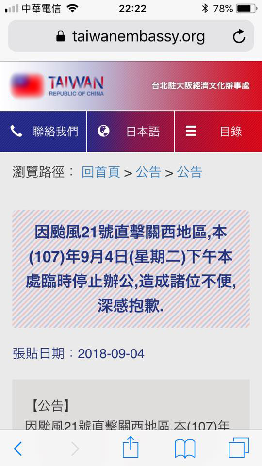 台风“飞燕”侵袭日本关西地区,导致台湾旅客于9月4日滞留大阪关西国际机场。有网友发现“台北驻大阪经济文化办事处”(以下简称“办事处”)曾在旅客滞留当天发布“停止办公”公告,但后来又删除,质疑该单位为了掩饰自己无所作为而“造假”。