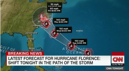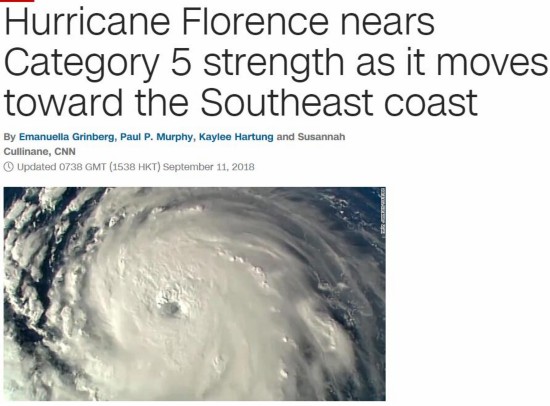 美国有线电视新闻网(CNN)9月11日报道称,美国东海岸南部周二(11日)将迎来飓风“佛罗伦萨”,目前风速已经达到每小时140英里,强度接近5级。