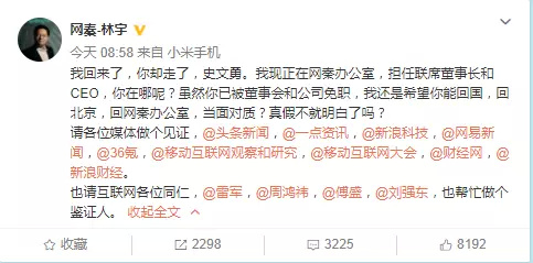 据媒体公开报道,2014年12月10日林宇从网秦的突然离开,尽管令业界惊讶,但看起来仍然是一桩上市公司正常的人事变动——彼时由于被爆出伪造业绩,网秦股价一路从24美元跌至10美元以下。业绩不好、联合创始人退出、林宇将公司交棒给另一位联合创始人——自己的高中同班同学,相识20多年的好友史文勇。那时,有媒体称史文勇为临危受命。