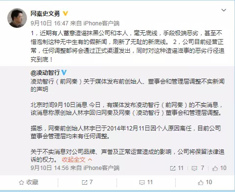 9月11日,“凌动智行”品牌公关总监王宏明接受红星新闻记者采访时表示,公司更名原因与领导高层变动无关,纯粹是公司业务多元化发展的战略原因。他还表示,公司董事长依然是史文勇,林宇的“回归声明”并不合程序,甚至是难以容忍。
