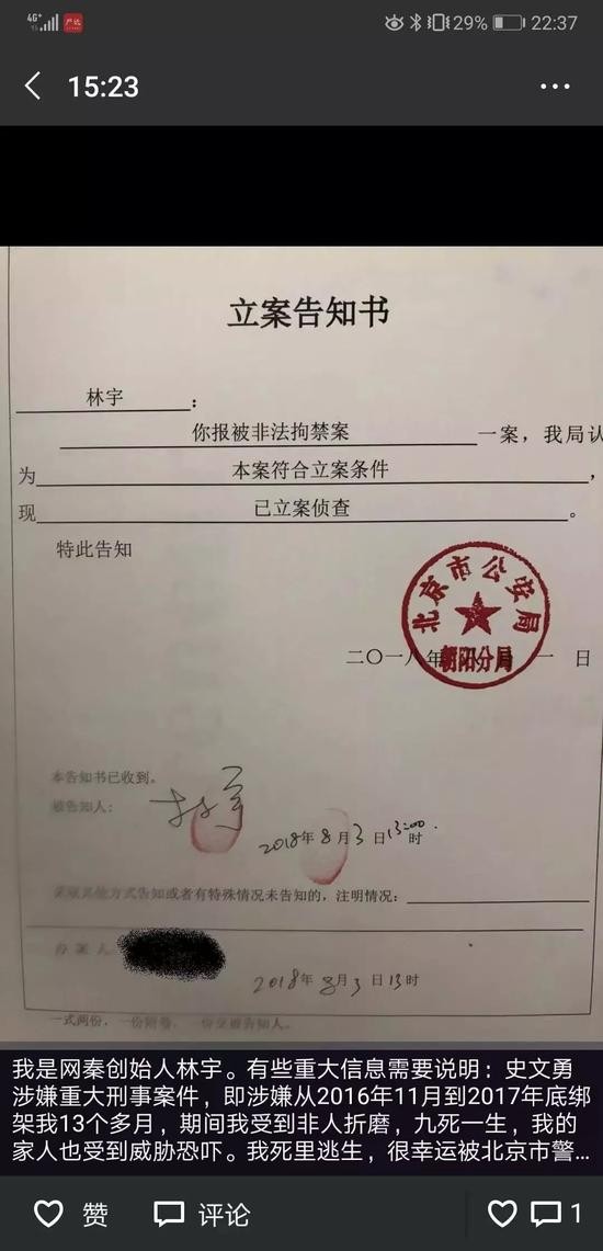 让人意外的是,林宇在朋友圈声称,“史文勇涉嫌重大刑事案件,从2016年11月到2017年底绑架我13个多月,期间我受到非人折磨,九死一生,我的家人也受到威胁恐吓。我死里逃生,很幸运被北京市警方解救。”