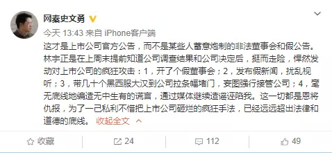 林宇此前在接受媒体采访时也表示,自己是控股大股东,可以调整整个董事会。而且现在董事会已经做出决定,免除史文勇和许泽民的董事和公司一切职务。