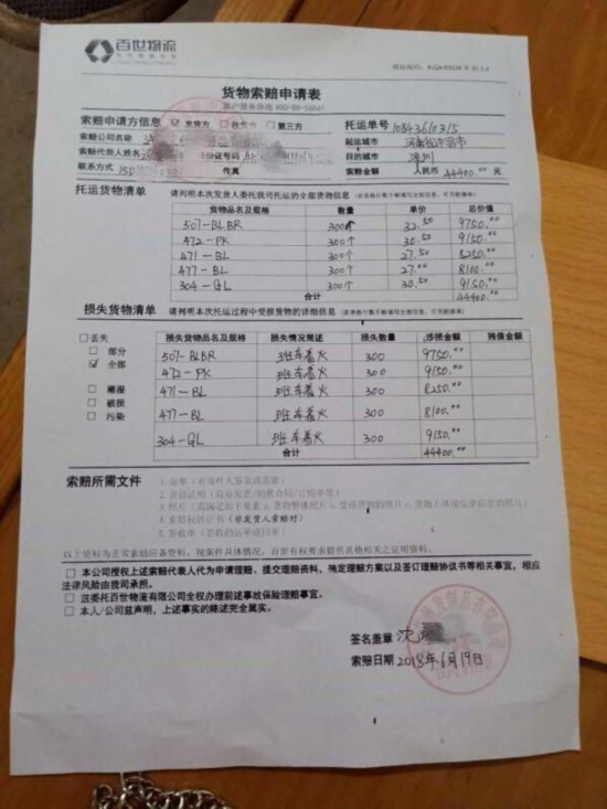 无奈沈先生只能又补发了一批货物给深圳的客户。不过沈先生说自己在发货时曾为货物购买了5000元的保价金额,随后沈先生便联系百世快运协商理赔事宜。百世快运的工作人员曾在6月22日左右通知沈先生和其他发货人到郑州郑州分拨中心认领烧毁后剩余货物并填写《货物索赔申请表》。