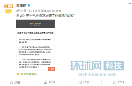 【环球网科技 记者 林迪】日前,针对近日长租公寓租住房间的空气质量问题,自如官方微博发布《自如关于空气检测及治理工作情况的说明》。对此前承诺的相关工作进行了阶段性说明并承诺在寻求到系统性解决方案之前:9月24日开始,所有首次出租房源,配置完成后,必须同时满足空气质量经权威机构检测合格且空置30天以上才能上架出租。