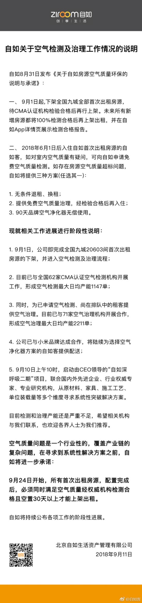 9月11日,自如在官方微博中对此前承诺的相关工作进行了阶段性说明:9月1日,公司完成全国九城20603间首次出租房源的下架,并进入空气检测及治理流程;目前已与全国62家CMA认证空气检测机构开展工作,形成空气检测最大日均产能1147单;已与71家空气治理机构开展合作,形成空气治理最大日均产能2211单。