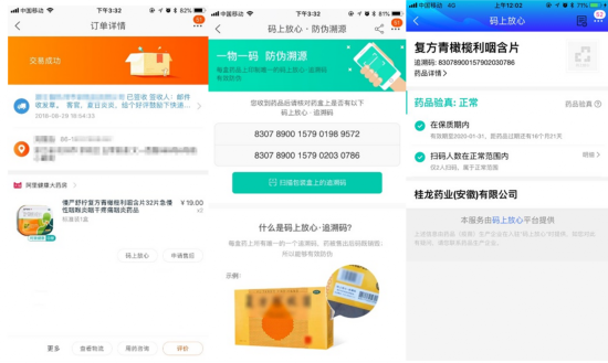 将“码上放心”追溯信息与医药电商订单绑定,为用户提供药品验真服务,是阿里健康大药房的另一个特色。记者在阿里健康大药房购买了一盒治疗咽喉疼痛的药,待发货后点开订单,就可以发现所购药品下方的“码上放心”按钮,点击后即可以显示药品的追溯码信息。消费者在购买药品后可以通过订单上的追溯码信息比对收到的药盒,确认“所买即所得”,避免物流过程中药品被调包的问题,用手机淘宝、支付宝和阿里健康App扫码后,还能了解药品的更多信息。