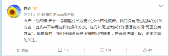 新浪科技讯 9月12日晚间消息,针对四处流传的所谓“天字一号阿里公关方案”的文件,阿里巴巴集团CEO助理颜乔在微博中称,他们没有用过这样的公关方案,也从来不会用这样的操作方式。