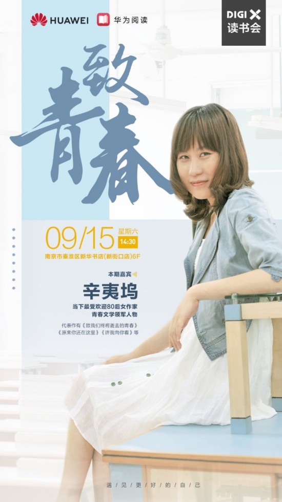 9月15日,DigiX数字生活节期间,华为还将在南京莱迪广场新华书店六楼举行“DigiX读书会”。华为阅读邀请了深受年轻读者喜爱的青春文学作家辛夷坞将亲临现场,与读者分享阅读的乐趣。更有江苏凤凰文艺出版社总编辑汪修荣、南京师范大学文学院副教授孙道功,与作家展开圆桌论坛,共同对青春文学、高品质阅读等话题展开讨论。华为终端云服务和华为阅读希望通过借以此类与知名作家面对面互动的活动平台,带动更多的年轻人多阅读、读高质量的作品。