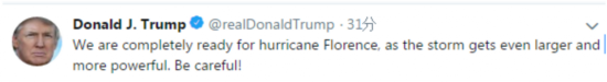 就连美国总统特朗普也在推特上写道:“我们已经完全准备好面对飓风佛罗伦萨,风暴会变得越来越大,越来越强。要小心!”