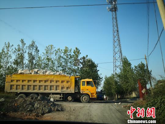 12日,中新网记者来到武安市淑村镇大淑村矿进行走访。一走进矿区,首先看到的是位于煤矿西南角高达几十米高的矸石山,矸石山周边有大货车车辆在穿梭作业,来往的货车并没有进行任何覆盖,车内的石灰和煤屑散落在道路两侧。