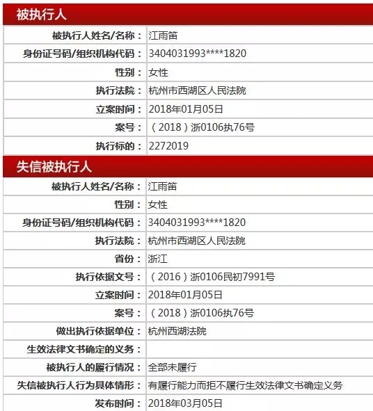 记者在最高人民法院“失信被执行人”的名单中看到,“入江闪闪”(江雨笛)依旧在列。
