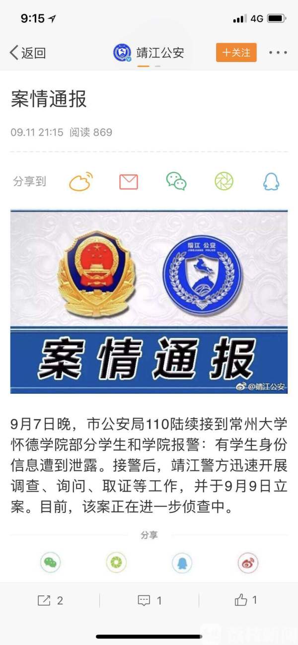 9月11日晚间,常州大学怀德学院所在地的靖江警方发布通报,从9月7日晚陆续接到学院部分学生和学院报警后,警方迅速开展调查、询问、取证等工作,并于9月9日立案。今天下午,当地派出所表示,案件已经有所突破,有泄露信息的人已经被拘留。