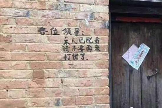 最近,一张贫困户家的“门前照”火了,有些许年代的木质大门紧闭,旁边斑驳的红砖墙上,是几行毛笔字:“各位领导:本人已脱贫,请不要再来打扰了”。