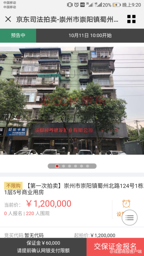 记者在京东司法拍卖网上注意到注意到,这处房产将于10月11日早上10点开拍,起拍价为120万截至9月13日晚上9点,已经有219人围观。
