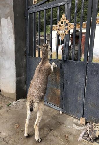 68岁的杂多县昂赛乡老兽医求军结束了一天的工作,背着沉重的药箱回到家中,关上庭院大门的一刻,一只可爱的小岩羊突然蹿了出来,趴在大门上撒着娇,不愿离去。
