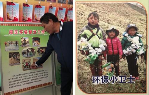 图左为昂塞乡乡长旦增文秀向记者介绍“垃圾换文具”活动,图右为学校评选出的“环保小卫士”。人民网记者 余璐摄