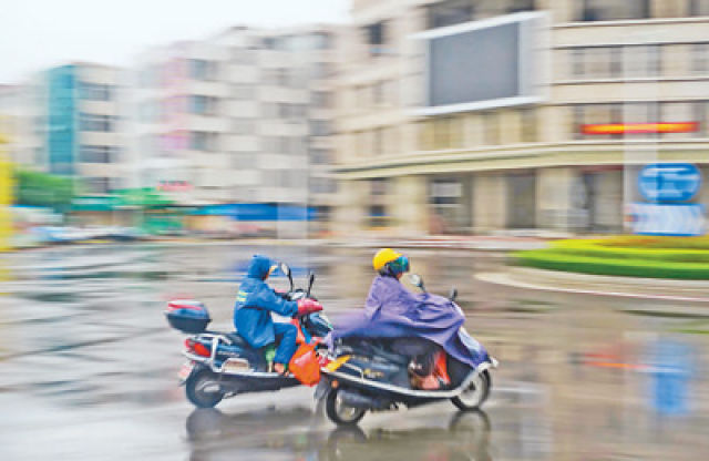 ↑13日,广东湛江廉江市,市民冒雨出行。
