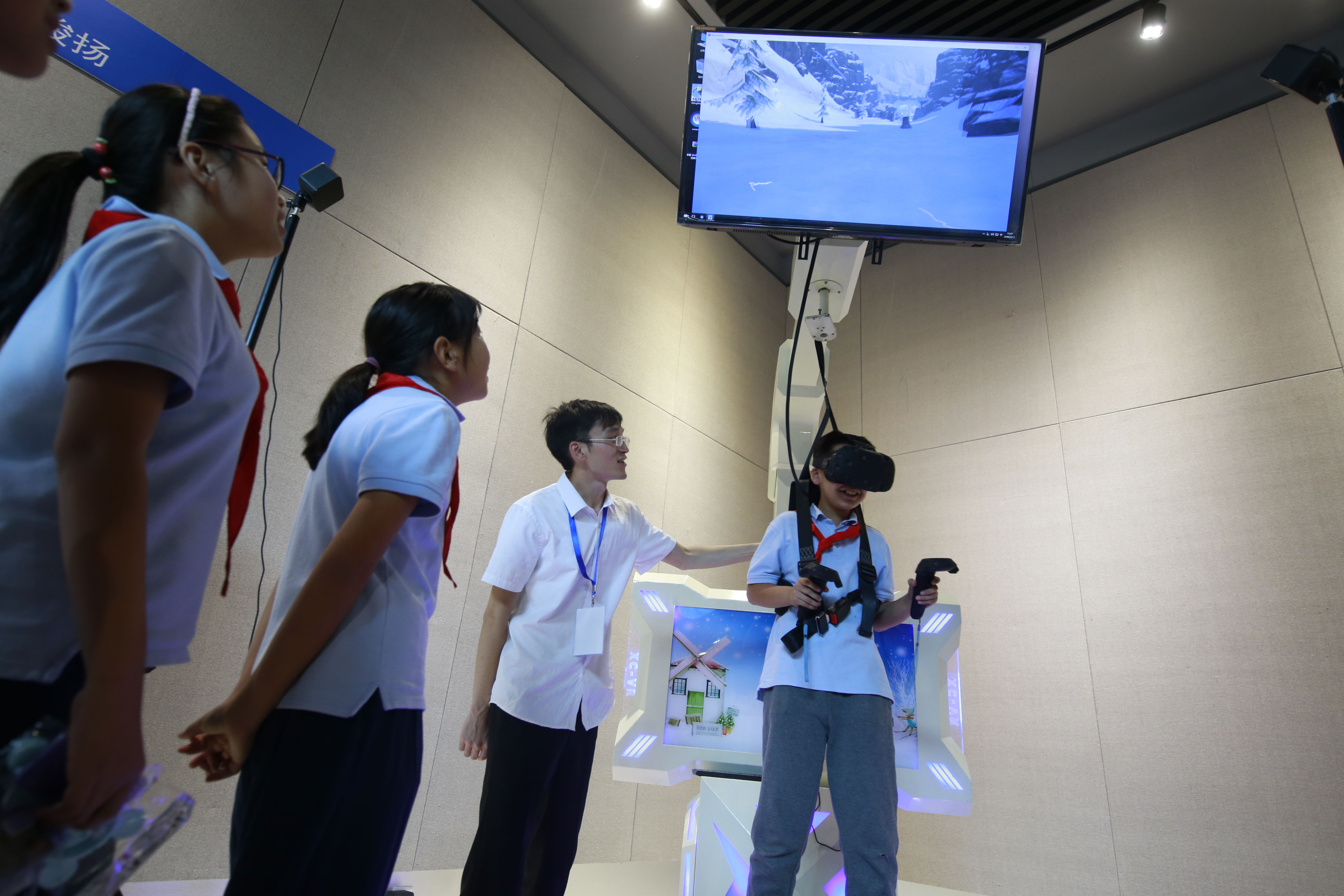 戴上VR眼镜,脚踏滑雪靴,登上模拟平台,双手前后摆动无线摇杆,仿佛置身阿尔卑斯山的滑雪场,一会弯腰速滑深谷,一会挥动雪杖攀爬上巅峰,有手感有脚感,让从没滑过雪的江南孩子格外开心。
