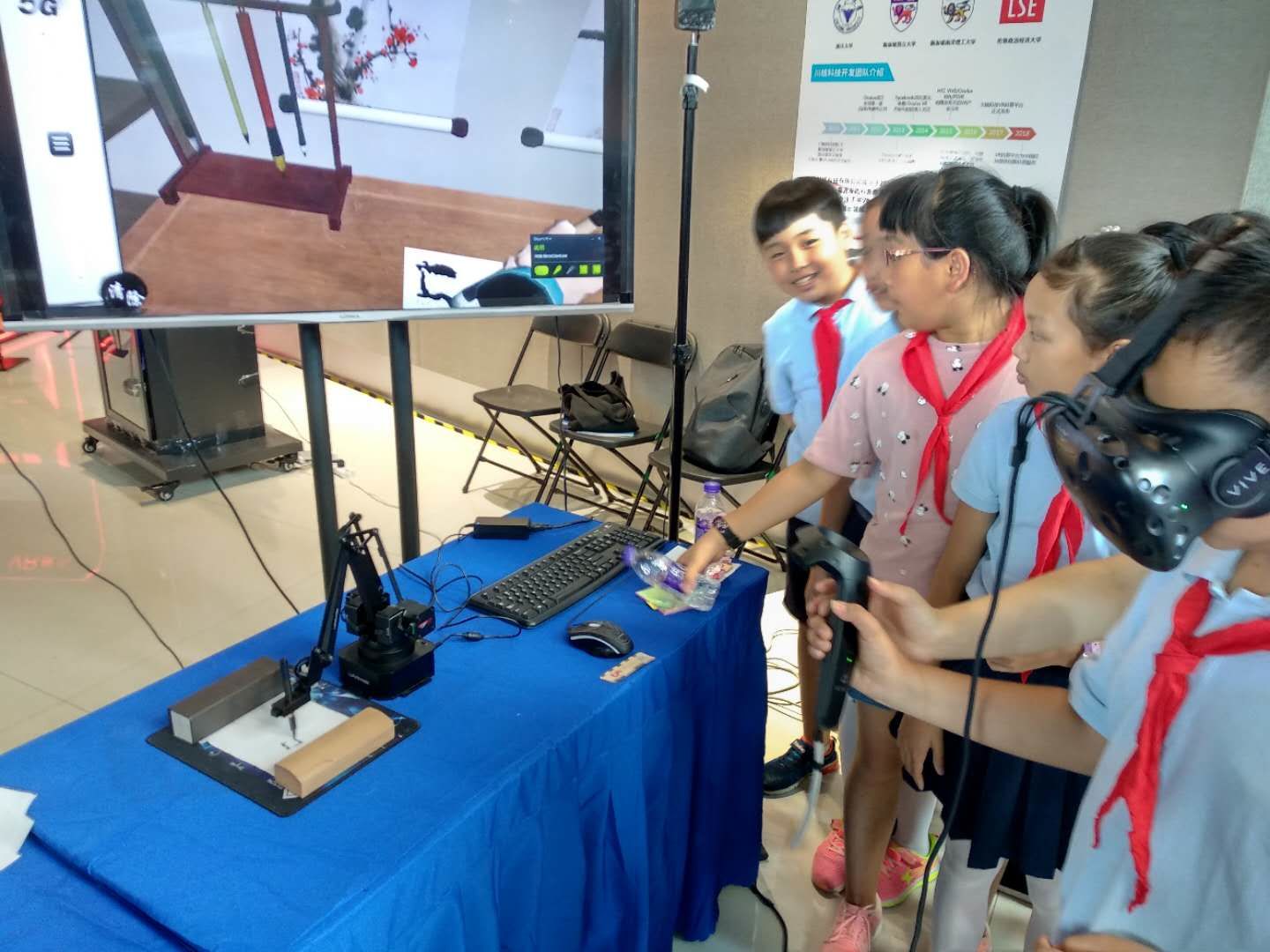 另一类VR设备让小朋友们更惊奇:他们在这边戴上VR眼镜,手握遥控杆,走进一间虚拟书房,在空气中“挥毫泼墨”,而另一边,一台机械手臂正握着毛笔,按照“小主人”提笔的力度和姿势写大字呢。