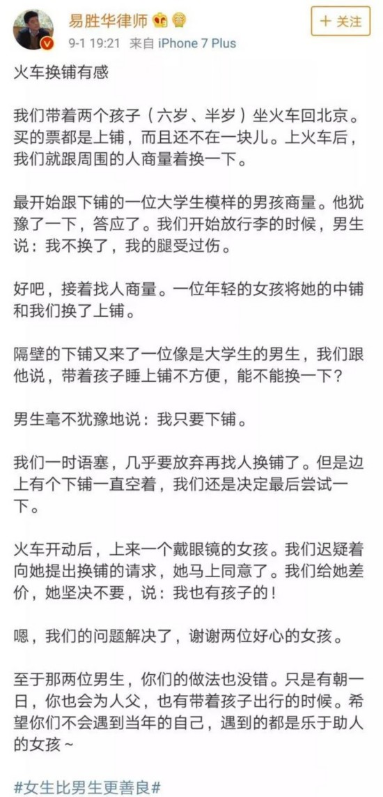 事后,这位微博拥有将近200万粉丝的律师,写了一段《火车换铺有感》:
