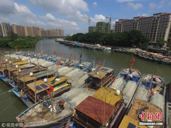 资料图:中山市石岐河张溪段,大量渔船回港避风。 图片来源:视觉中国