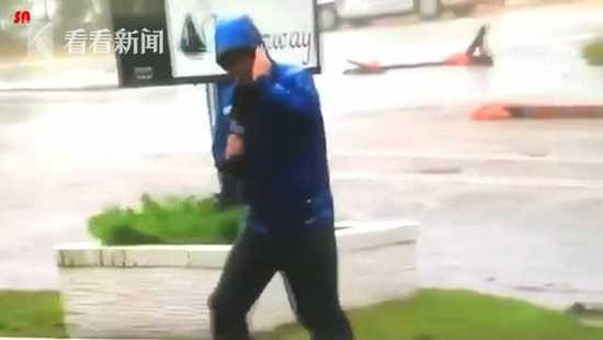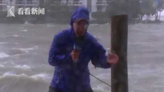 记者直播飓风缩头岔腿站不稳 身后俩短裤男悠哉路过出卖了他