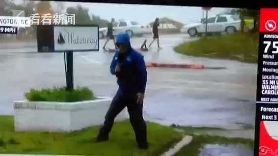 飓风"弗洛伦斯"昨天(14日)早晨在美国北卡罗来纳州的赖茨维尔比奇附近登陆,带来严重风暴潮。一名"追风"记者在直播中故意缩头岔腿,做出"风大站不稳"的夸张之举,岂料被身后的两名路人"出卖",遭致网友炮轰糗大了。