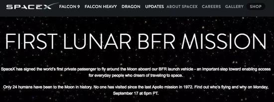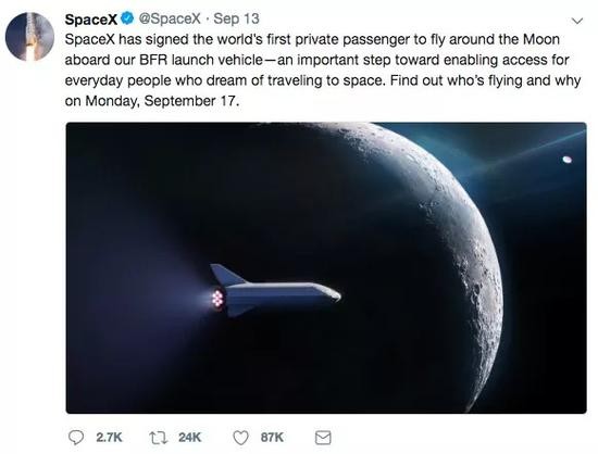 9月14日,美国私人太空公司SpaceX发布推特宣布,他们签署了一份合同,世界上首位私人旅客将乘坐他们的大型猎鹰火箭(BFR)绕月飞行。