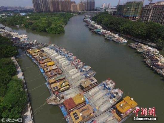 9月13日,中山市石岐河张溪段,大量渔船回港避风。图片来源:视觉中国
