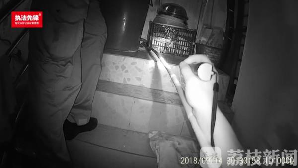 民警赶到现场时,看到一条菜花蛇躲在一个桶后,他们一边用晾衣杆按住蛇的身体,一边将桶轻轻移开,待蛇头露出后,一位民警直接上前,用手抓住头部,将蛇控制。