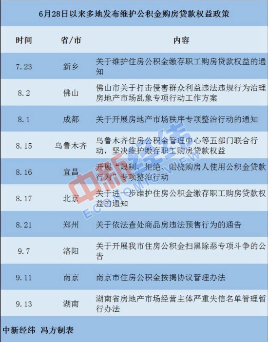 据中新经纬客户端(微信公众号:jwview)不完全统计,自6月28日通知公布以来,新乡、佛山、成都、乌鲁木齐、宜昌、北京、郑州、洛阳、南京等9座城市以及湖南省相继发布公积金新政,专门针对通知中整治房企拒绝、变相拒绝公积金贷款购房的违规行为进行整治。