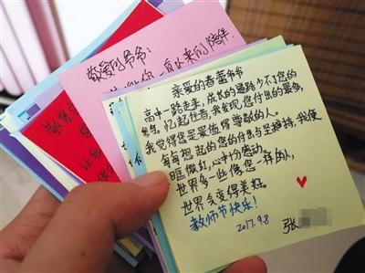他的付出,得到了孩子们的认可。他曾收到一个学生们送的盒子,贴纸写着,“2017年9月9日,1801全体学生,共计41人”。盒内放着41张卡片,卡片上都写着春蕾女孩对这位老人的祝福。
