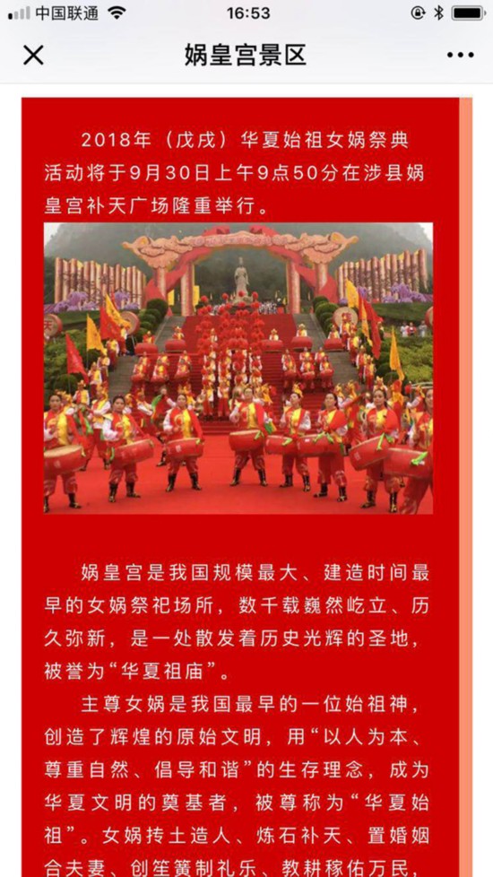 近日,涉县旅游开发有限公司微信公众号“娲皇宫景区”面向社会发布的一则通告显示:2018年(戊戌)华夏始祖女娲祭典活动将于9月30日上午9点50分在涉县娲皇宫补天广场隆重举行。