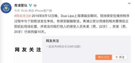 9月16日下午,@青浦警坛发布微博消息称,2018年9月12日晚,Dua Lipa上海演唱会期间,现场保安在维持秩序过程中与个别歌迷发生争执,有保安脚踹歌迷。青浦公安分局接到相关警情后立即赶赴现场处置,并依法对殴打他人的保安人员朱某(男,22岁)、奈某(男,20岁)行政拘留10天。