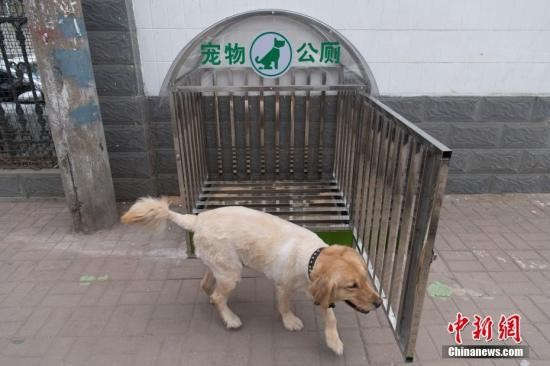 资料图:一只金毛犬刚刚使用完“狗狗公厕”。 韦亮 摄