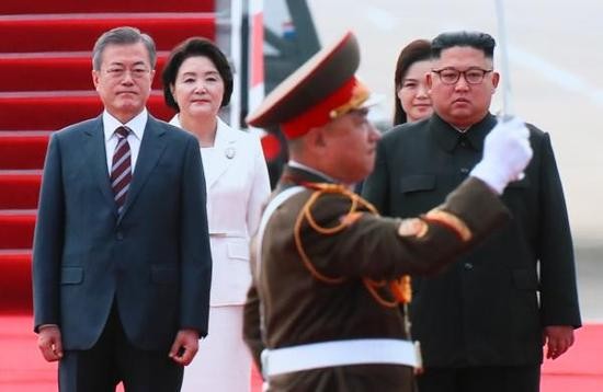 文在寅于当地时间18日上午9时49分(北京时间8时49分)许乘专机抵达平壤顺安机场,成为第三位访问朝鲜的韩国总统。金正恩偕夫人李雪主亲赴机场迎接。