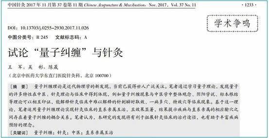 全球最顶尖的物理学家们,怎么也不会想到,他们还在实验、探索、论证的量子纠缠,其理论和技术应用,已经莫名其妙在一些领域开花结果。近期最“轰动”的,莫过于北京中医药大学东直门医院针灸科的几位医师,发表了一篇形似论文,但又不承认是论文的《试论“量子纠缠”与针灸》。