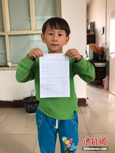 7岁的小小(化名)给记者看她刚练习完的拼音。 李庭耀 摄