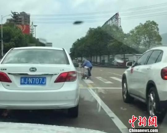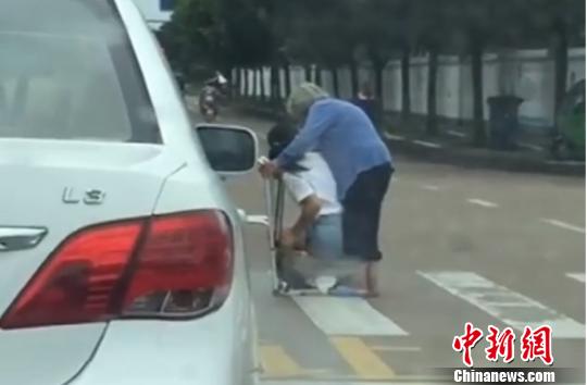 图为:后车司机拍到女司机正准备背老人过马路 王子豪 摄