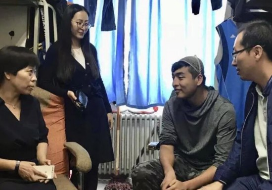 紧急送医后,左旭头部被缝了8针,现已脱离危险期。图为师生看望左旭。