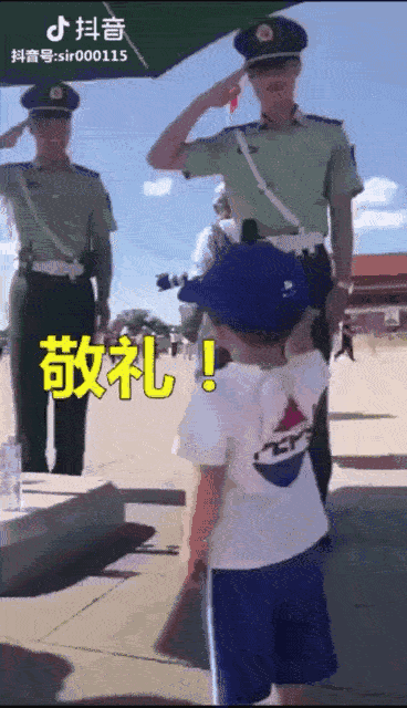 一个可爱的小男孩给站岗的武警叔叔敬礼
