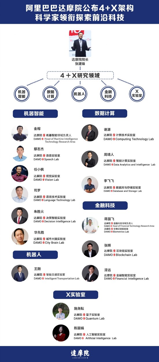 阿里巴巴在这一天公布达摩院的最新架构。4+X实验室。如同四轮驱动的跑车,再加上一处神秘的动力引擎,共同承载着这个中国企业中人才含金量最高的科研机构飞奔。