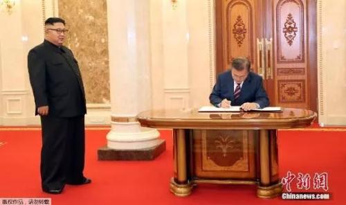 在玉流馆共同进餐之前,金正恩和文在寅在百花园迎宾馆,共同签署了9月《平壤共同宣言》,在缓解军事紧张、实现无核化、改善朝韩关系等方面达成了多项协议。