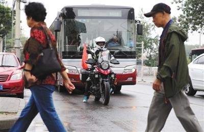 9月18日,北京公交集团第四客运分公司驾驶员肖兵骑着摩托在斑马线前等待行人通过。新京报记者 王贵彬 摄
