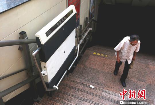 资料图:地下街的无障碍升降梯旁,一名老人蹒跚步行上行。李俊锋 摄