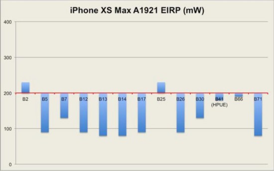 高于200 mW的频段更少了,而且iPhone Xs系列在B41频段还采用了HPUE技术(高发射功率),结果是iPhone Xs的EIRP值合格了,但价格更贵的iPhone Xs Max依旧在及格线以下。