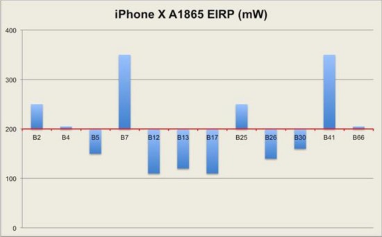 当然,只是通过使用体验来说明iPhone信号强弱不够准确,FCC(美国联邦通信委员会)的测试数据显示,iPhone X的EIRP(有效全向辐射功率)值在多个频段都低于标准传输功率200 mW。